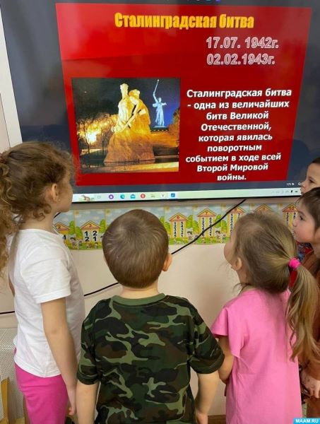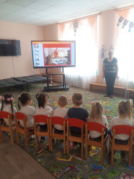 Воспитанникам была представлена презентация «Сталинградская битва», педагоги рассказали дошкольникам, что Сталинградская битва по продолжительности и ожесточенности боев, по количеству участвовавших людей и боевой техники, по огромной территории превзошла на тот момент все сражения мировой истории.